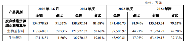 公司废弃油脂资源综合利用业务所用原材料主要为废弃油脂,呈总量丰富、来源广泛、组分复杂、品质差异明显的特点。公司对废弃油脂中可酯化物(脂肪酸及脂肪酸甘油酯)提纯,并针对可酯化物的化学组成和结构表征,改性合成生物柴油(脂肪酸甲酯),用作生物燃料或进一步制备为生物基材料。生物基材料主要为生物柴油配方产品和工业级混合油,其中1)生物柴油配方产品系应用于农药、化肥、选矿、油墨树脂、纺织、生物医药等多个领域的助剂,能够发挥溶解、增效、分散、润滑等作用。助剂指在工业生产中,为改善生产过程、提高产品质量和产量,或者为赋予产品某种特有的应用性能所添加的辅助剂。发行人生产的生物柴油配方产品主要系以生物柴油(脂肪酸甲酯)为核心成分,考虑客户下游应用的需求及效果后,与天然植物油、矿物油、表面活性剂等成分复配而成的助剂产品;2)工业级混合油系废弃油脂根据客户需求,对废弃油脂实现了标准化处理后达到工业级使用标准的产品。公司生产的生物燃料主要为生物柴油。生物柴油通常指由动植物油或废弃油脂与甲醇(或乙醇)在催化剂的作用下酯化反应形成的脂肪酸甲酯(或脂肪酸乙酯),属于生物燃料的一种,具有十六烷值高、低硫、无芳烃等特点。由于原材料通常为各类废弃油脂,组分复杂多样,因此生产的生物柴油为分子式碳链长短不一、饱和与不饱和键含量不一的长链脂肪酸甲酯混合物(C12-C20),常见成分包括油酸甲酯、棕榈酸甲酯、硬脂肪酸甲酯等。生物柴油可直接作为燃料使用或与化石柴油以一定比例掺混用于燃料能源领域,也可以制备为生物基材料应用于下游多个行业。目前公司作为生物燃料的生物柴油用于和化石柴油按一定添加比例掺混使用。生物柴油的燃料特性、起动性能以及发动机经济性、动力性均接近化石柴油且生物柴油具有更好的排放性能和可再生性。