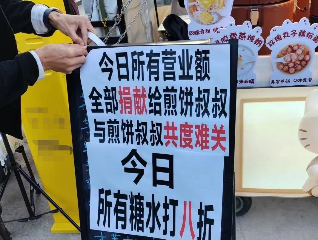 煎饼叔叔在医院里与一场突如其来的疾病战斗。而他身后的整条街,默默地、迅速地,为他“接管”了一天的营收。这可能是最朴素的众筹,来买餐食的人们,扫码支付的钱,将直接流向那个熟悉的叔叔。